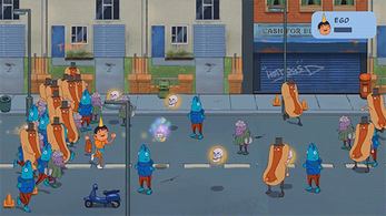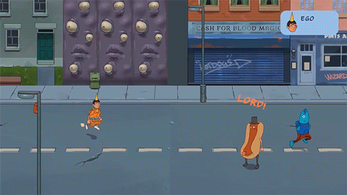 This was over the top weird and I loved it The rap at the start was great, the voices were ridiculous to match the characters, and the idea of his ego being his life bar was clever.